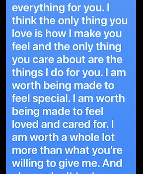 I felt tricked again and this time I had let myself be tricked. The truth is I saw some red flags early on, but I let them pass because they didn’t seem nearly as bad as what I went through in the past. When things gradually got worse, I called him out for trying to gaslight me, lie, or project his behaviors onto me. The problem is I didn’t view those things as reasons to walk away and stay away! I ended things with this partner a few times telling him I deserved better, but I always got love bombed back in. I had been so brainwashed in the past that the right words could make me believe things would be better. Instead of trying to work on those things with him, I should have ended things and walked away for good. I knew he was broken, yet I thought I could help him. This is what made me so upset with myself, this desire to heal him rather than protect myself.