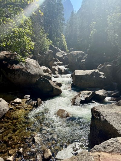 I spent that morning and early afternoon hiking in Yosemite. I can’t say enough about Yosemite. It’s stately, powerful, and just absolutely stunning! Sequoia stole my heart with its peaceful and majestic feel, but Yosemite overwhelms me at every turn. It’s just so beautiful. I went first thing that morning to walk the Mist Trail. I took route up the John Muir Trail and planned on taking the Mist Trail to loop it back to the start. This way I could see the top of Vernal Fall. It’s supposed to be a strenuous three-mile hike. Unfortunately, when I got to the split off for the Mist Trail, it was closed. I’m not sure what was going on, but Search and Rescue was blocking the entrance. That meant if I wanted to keep going, I would have to do the seven-mile all day hike up to the top of Nevada Fall. I already had plans to head to Napa, so I missed seeing the top of the falls. I headed back down the mile and a half I had already done and went to Yosemite Falls.